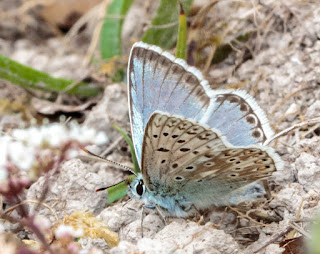 We are on our way down to Bournemouth for 5 days at the Bournemouth Airshow and stopped en route for the night at Fordingbridge so we could visit the nearby National Nature Reserve at Martin Down, renowned for its butterfly population. The weather was not ideal with light cloud and a bit of a breeze early on. All the butterflies that we found were low down in the vegetation and very few in number. We did find Dark-freen Fritillary adn Chalkhill Blue but no sign of the Adonis Blue or Grizzled and Dingy skippers. A large number of the butterflies had mite infestations as with the Common Blue and Meadow Brown shown below. Great to see a few Clouded Yellows even if deep in the vegetation. Even when the sun appeared there were very few butterflies in the air - strange when the flowers were so inviting